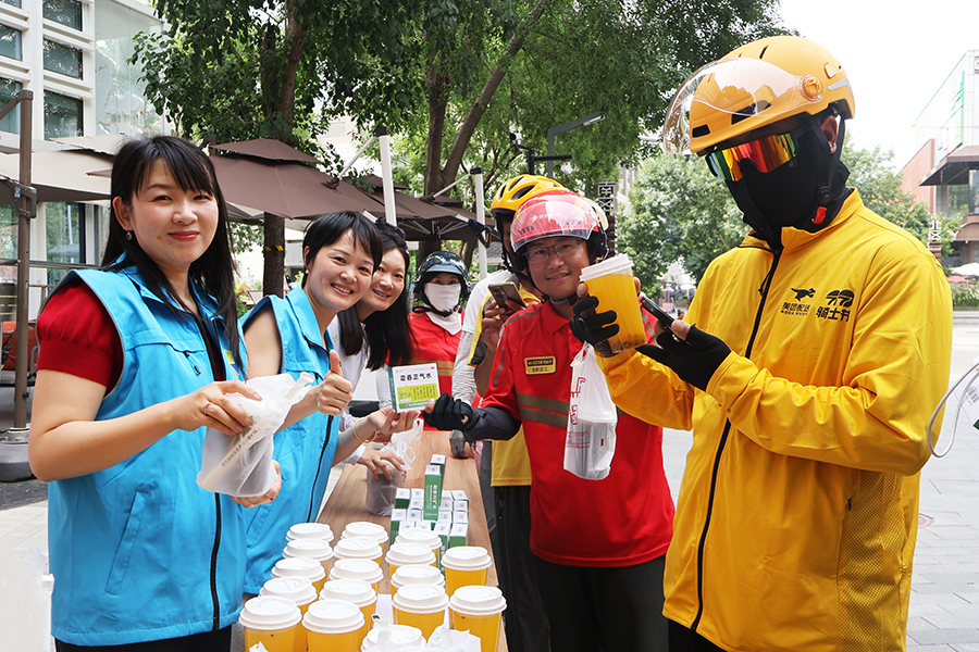 在北京医大中西医结合医院专业医师指导下,活动为外卖小哥等新就业群体成员免费发放了防暑药品藿香正气水。中粮祥云社区则同步送上冰镇冷饮与甘甜西瓜,为辛劳的骑手们带去丝丝沁凉,助其快速补充水分、恢复体力。一份份“健康+清凉”的实用礼包,承载着共建单位对新就业群体的诚挚敬意与贴心守护。