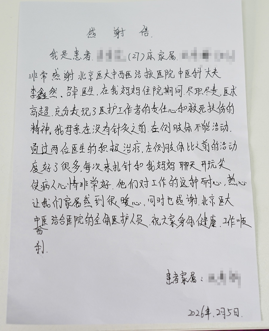 几乎在同一时间,李鑫然医生还收到了一封来自患者李阿姨女儿的感谢信。信中详细记述了其母亲因复杂脑积水经历多次手术、长期昏迷的艰辛求医路。为寻求进一步治疗,患者转入我院,由脑脊液科与中医科李鑫然医生协同诊疗。经过两个月坚持不懈的综合治疗,这位曾经昏迷卧床的患者,竟可以从床上坐起,并能在他人搀扶下进行行走。信中特别提到,李鑫然医生和同事们每次治疗时,不仅技术娴熟,更常与患者谈心,极大地舒缓了患者的紧张情绪,这种“有时去治愈,常常去帮助,总是去安慰”的职业精神,深深温暖了患者及家属。