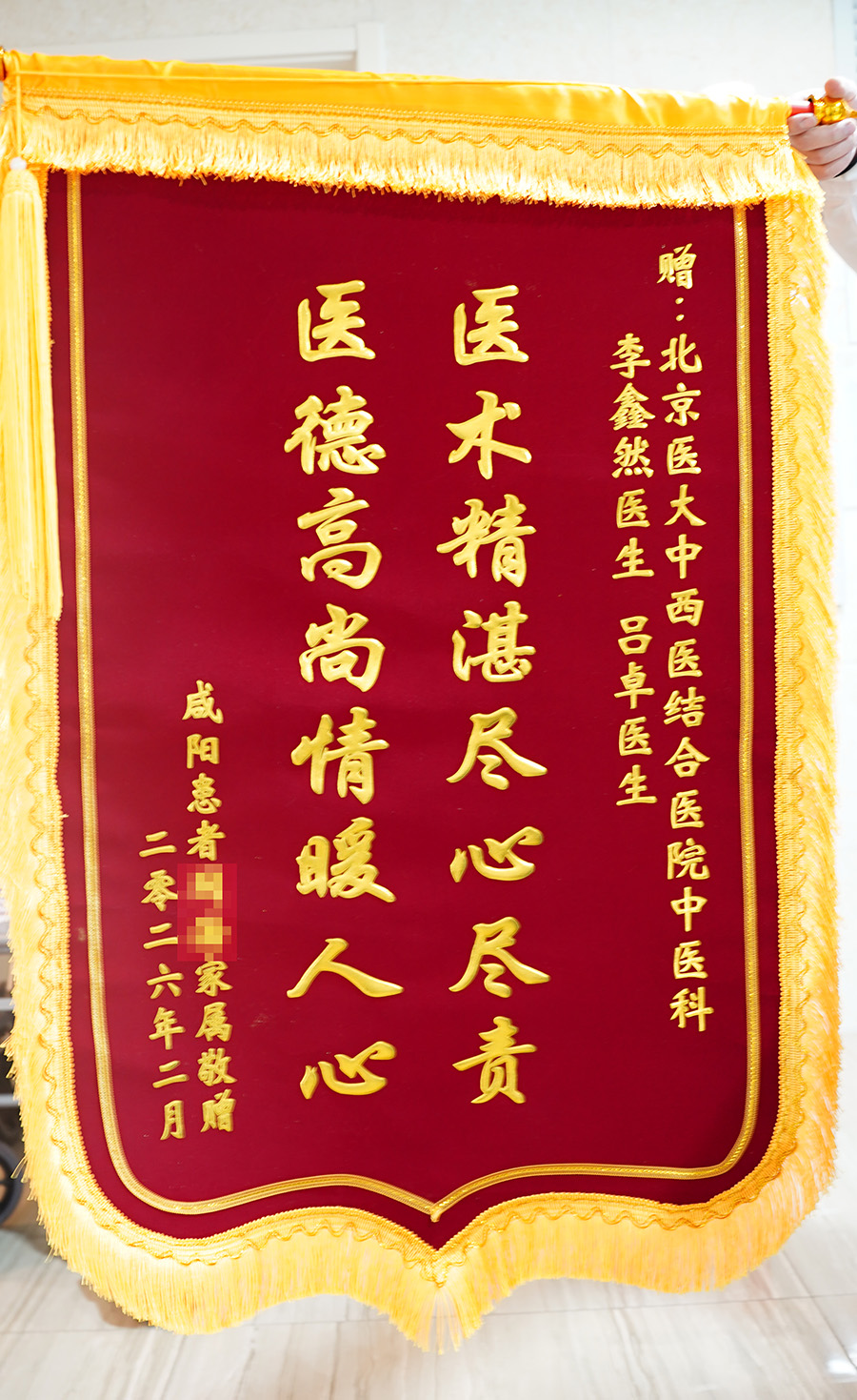 近日,北京医大中西医结合医院中医科李鑫然医生接连收到患者送来的锦旗与亲笔感谢信。锦旗上“医术精湛尽心尽责,医德高尚情暖人心”的金色大字,以及信纸上真挚朴实的感激之言,不仅是对李鑫然医生个人专业能力的肯定,更是对北京医大中医科团队坚持“以患者为中心”服务理念的生动诠释。