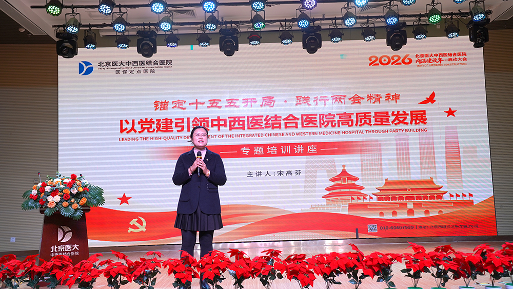 会上,我院特别邀请了中央党校马克思主义原理博士、“学习强国”平台特邀专家宋高芬女士,为大家作了题为《锚定十五五开局·践行两会精神——以党建引领中西医结合医院高质量发展》的专题培训。她结合当前政策形势与医院实际,深刻阐释了党建工作在引领医院内涵式发展中的核心作用,为全体职工带来了一场思想深刻、内容翔实的专题培训。